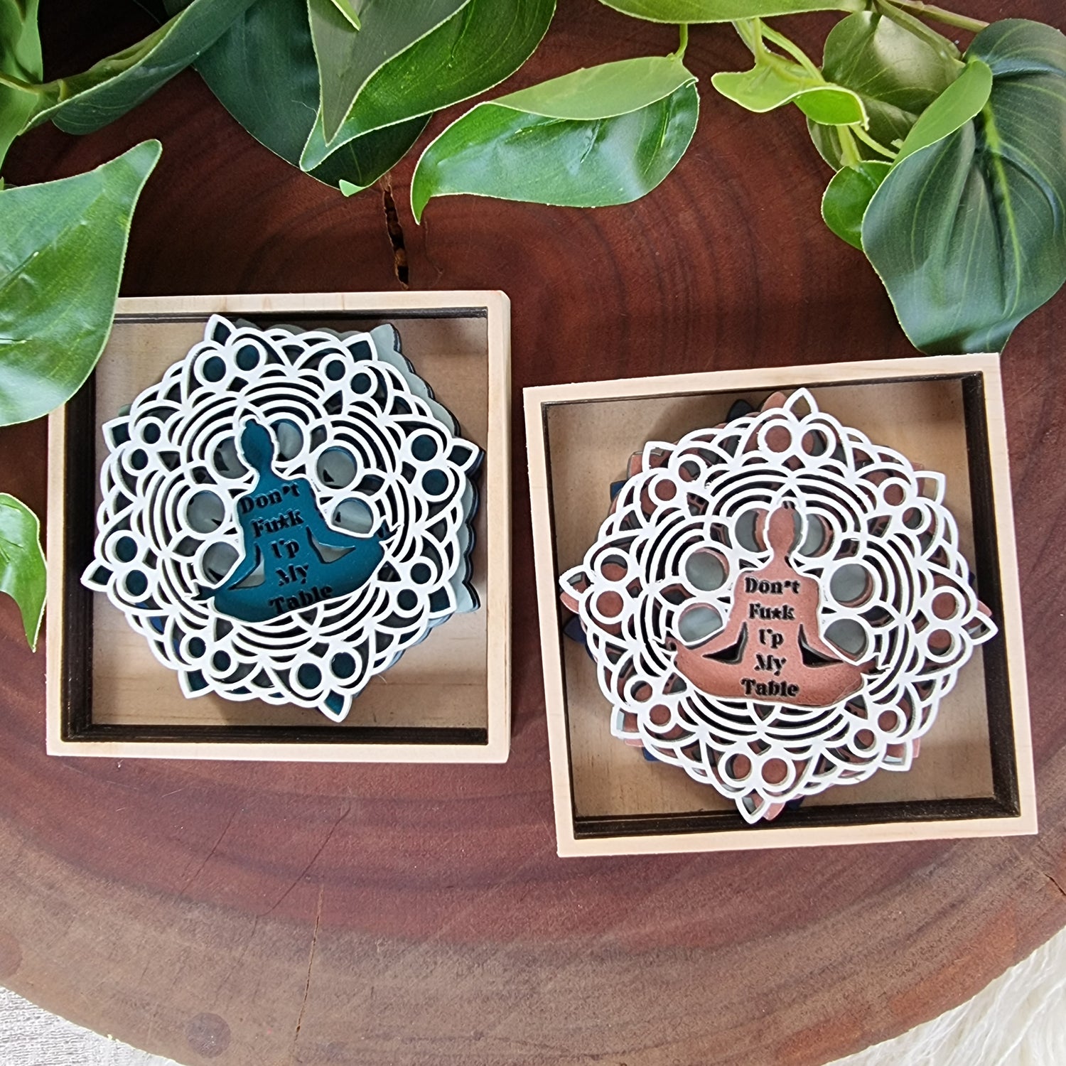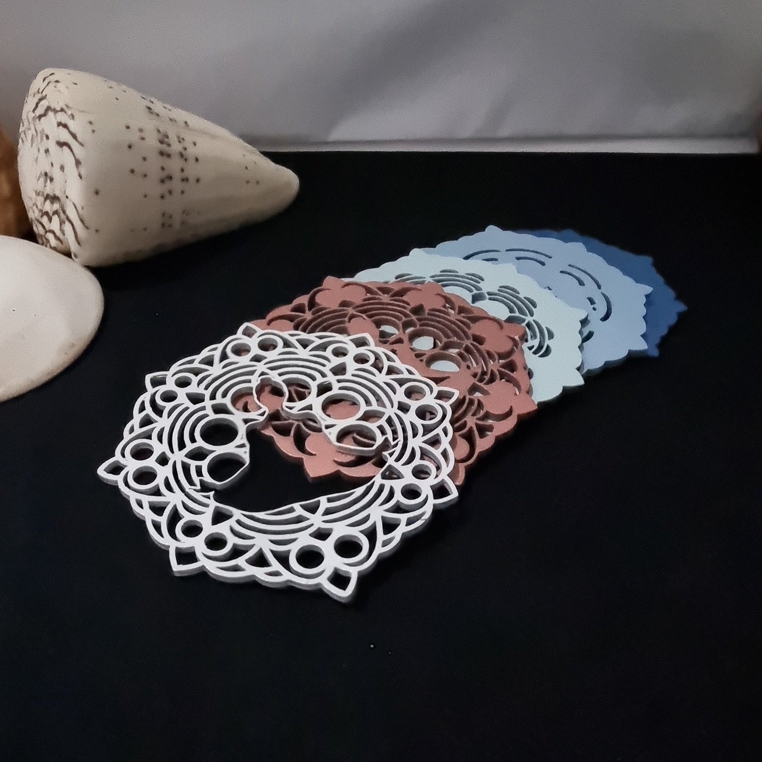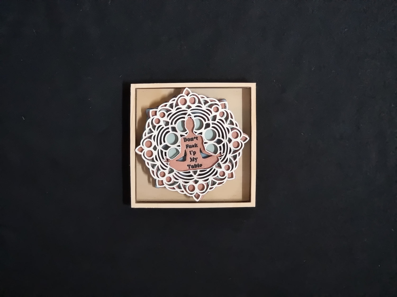 6 coasters in total, stored in open square box. Each coaster matches the next on the outside. Each coaster is coloured different.