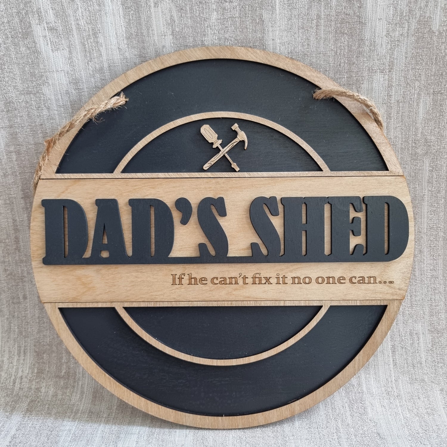 Round Dad's Shed Sign, if he can't fix it no one can.. -OR- If he can't fit it, we screwed