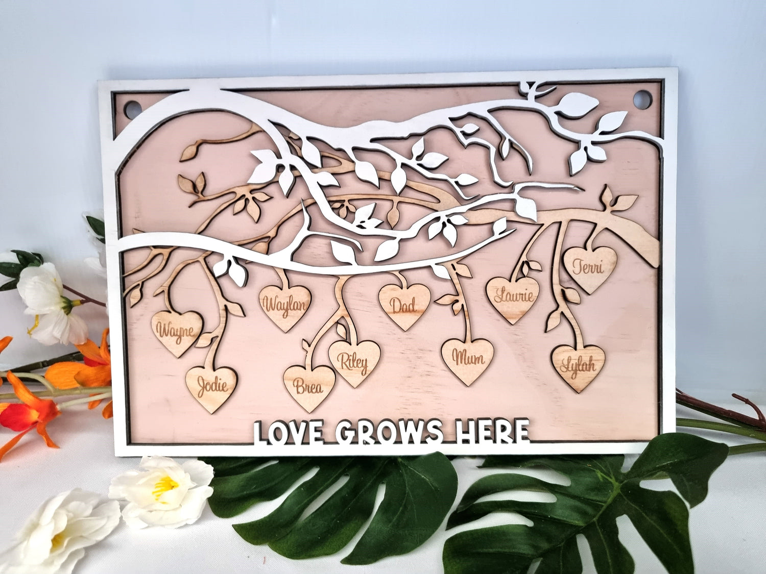 Hanging 3D Family tree is consistent of 3 layers of plywood. Each layer is a different colour to complement each other.