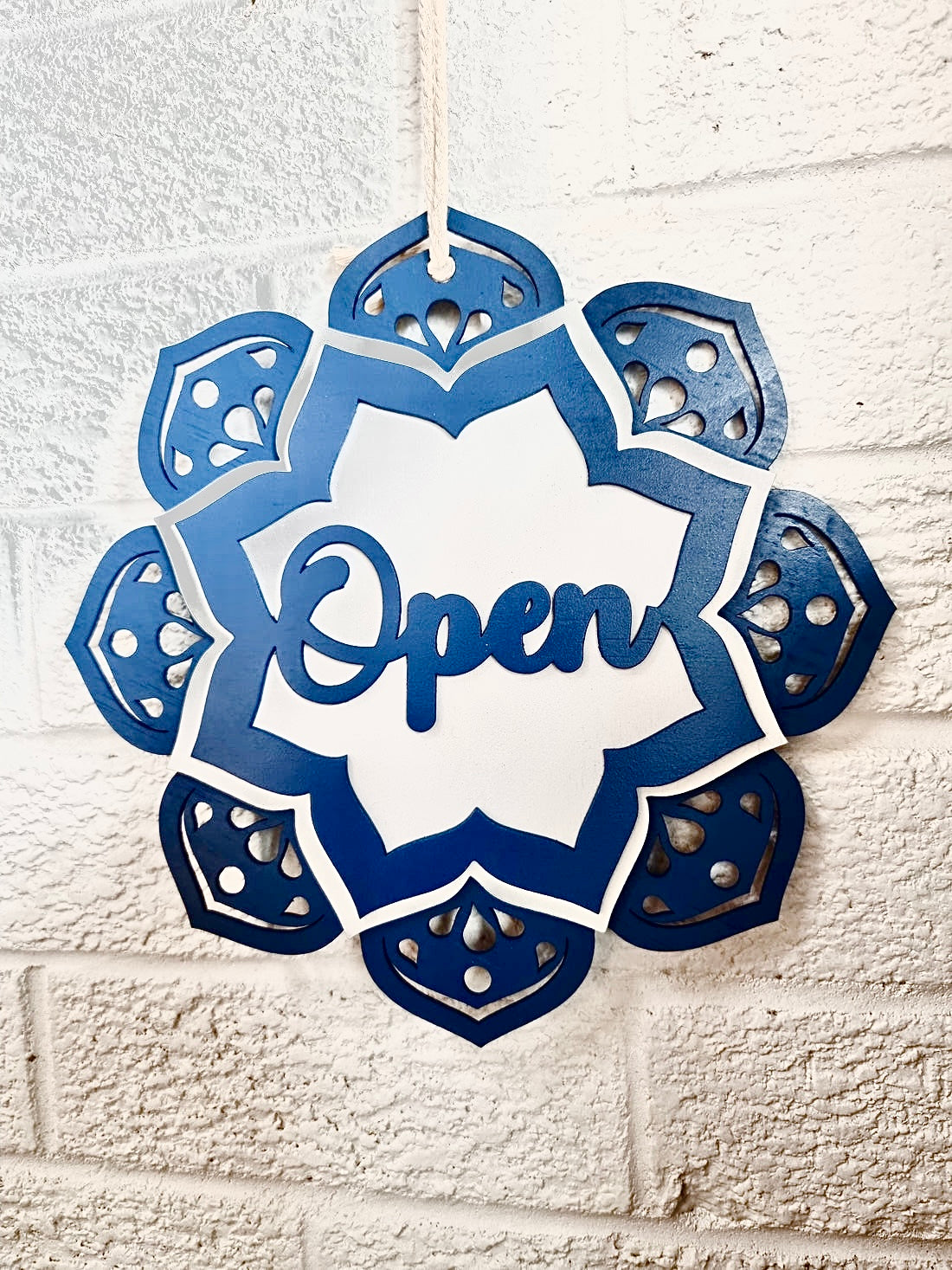Open and Close Mandala Sun hanging sign design for your shop front! Beautifully double-sided Hanging Sign. The sign is considers of 6 layers with a rope to hang of your wall or door. Display photo is Navy Blue with White background. All signs are white with a colour of your choice.