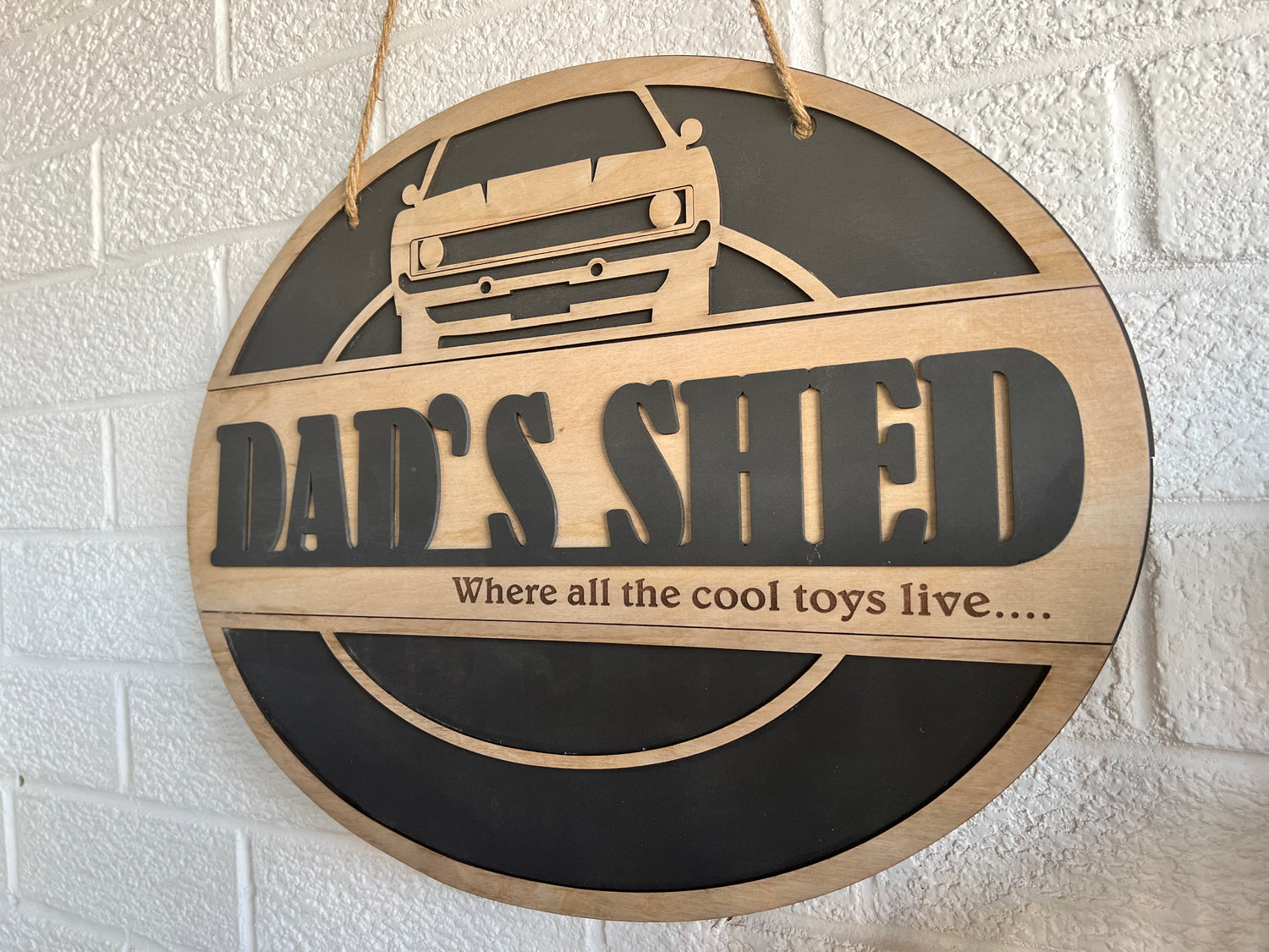 Our Dad's shed wooden sign is layered with plywood. Each piece laser cut and coated, with either a colour coat or clear.