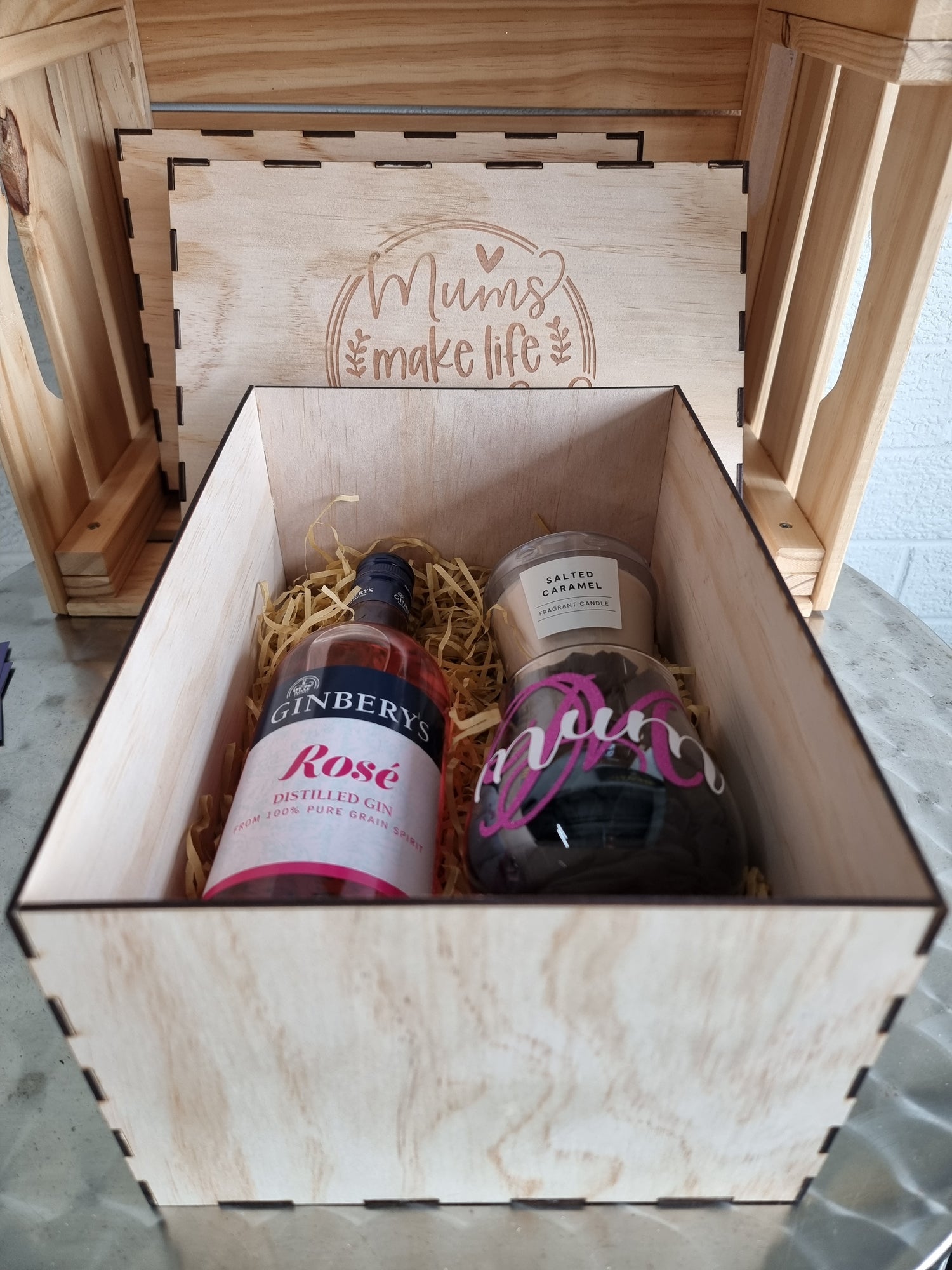 Beautiful personalized engraved wooden gift box. An unique custom and handmade box. Comes with a personalized tulip glass and salted caramel scented candle. (Image does show Rose distilled Gin bottle that is not included for sizing purposes only).
