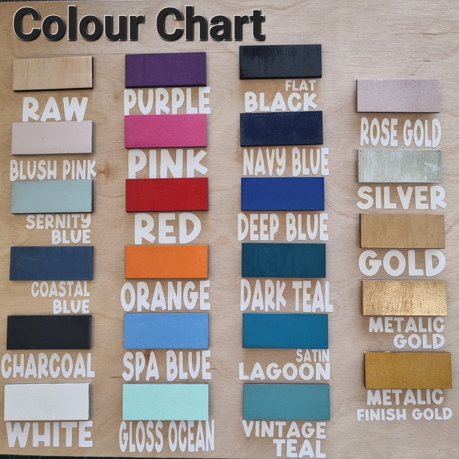 Welcome to the world, last name and design (leaf) is laser engraved. While their first name is separate piece of plywood painted. Colours of choice is listed below.