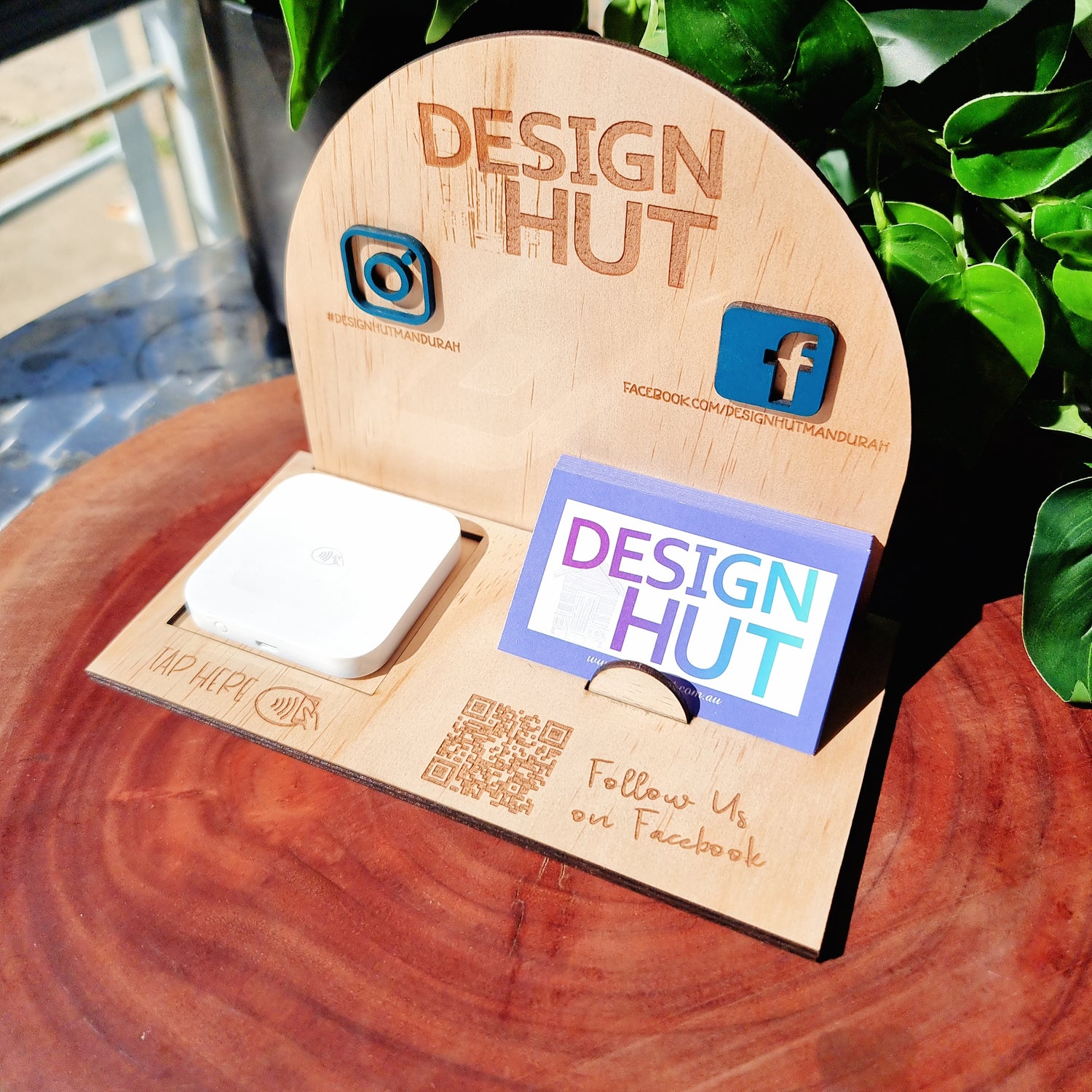 Each Dock has a place for Square reader and Buisness cards. There is room for your social media pages and Logo. QR Code can send your customers to your Facebook page, Instagram, Website.